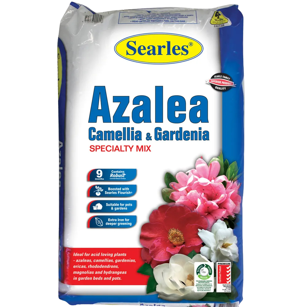 One of the most important aspects of acid loving plants is the availability of iron to the plant. Generally, iron is most available in acidic conditions, hence they are known as acid loving plants. Searles Azalea, Camellia & Gardenia Specialty Mix contains chelated iron, which is readily available to plants. This caters for many different scenarios such as, alkaline water applied to pot plants, and fertilisers applied after planting which may raise the pH after potting. In both situations, Searles Azalea, Camellia & Gardenia Specialty Mix boosts healthy growth from our advanced composting process and the included chelated iron which is readily available to the plant.
